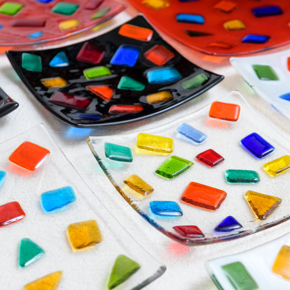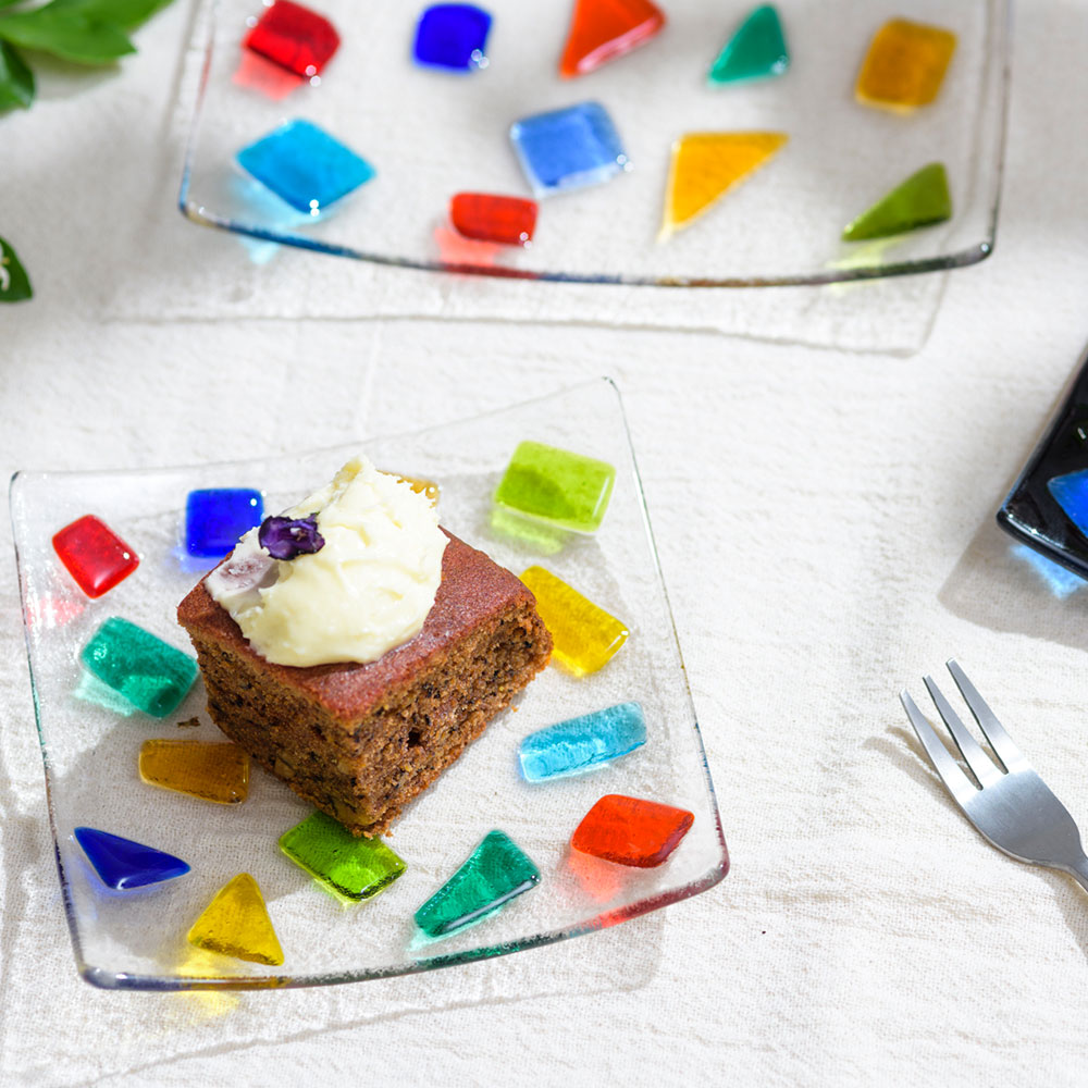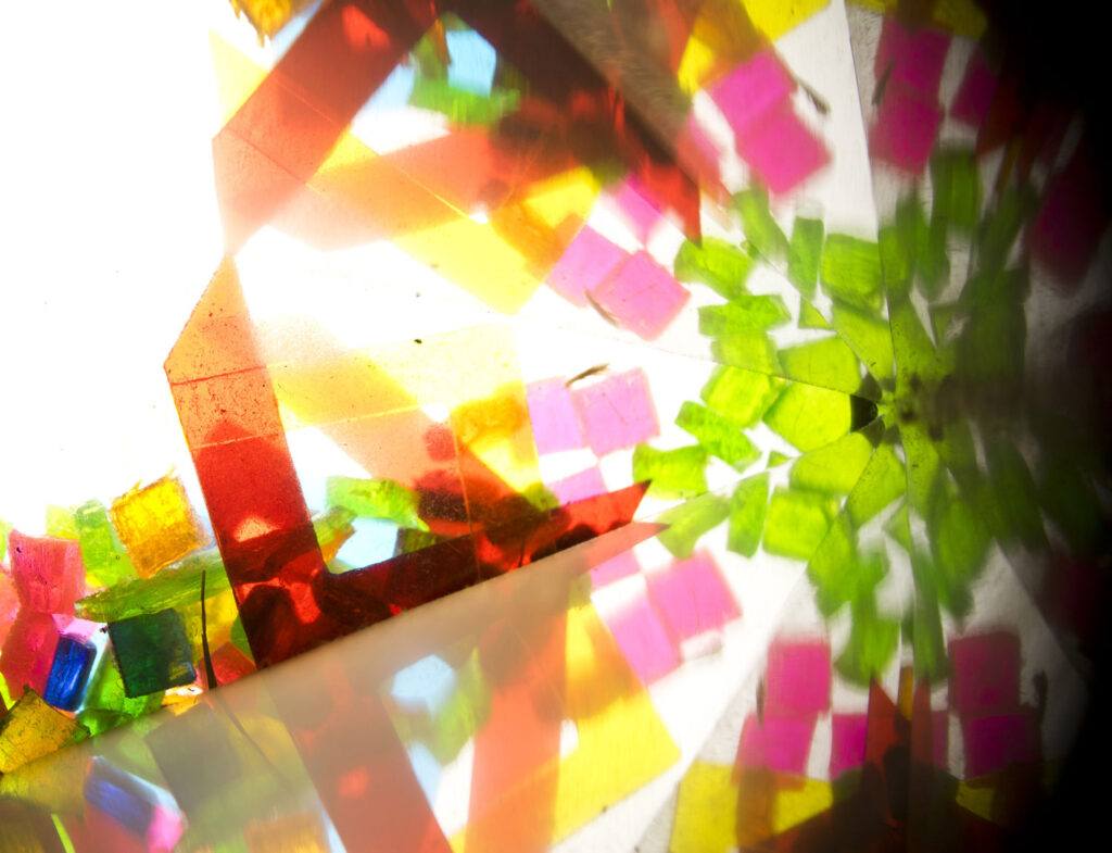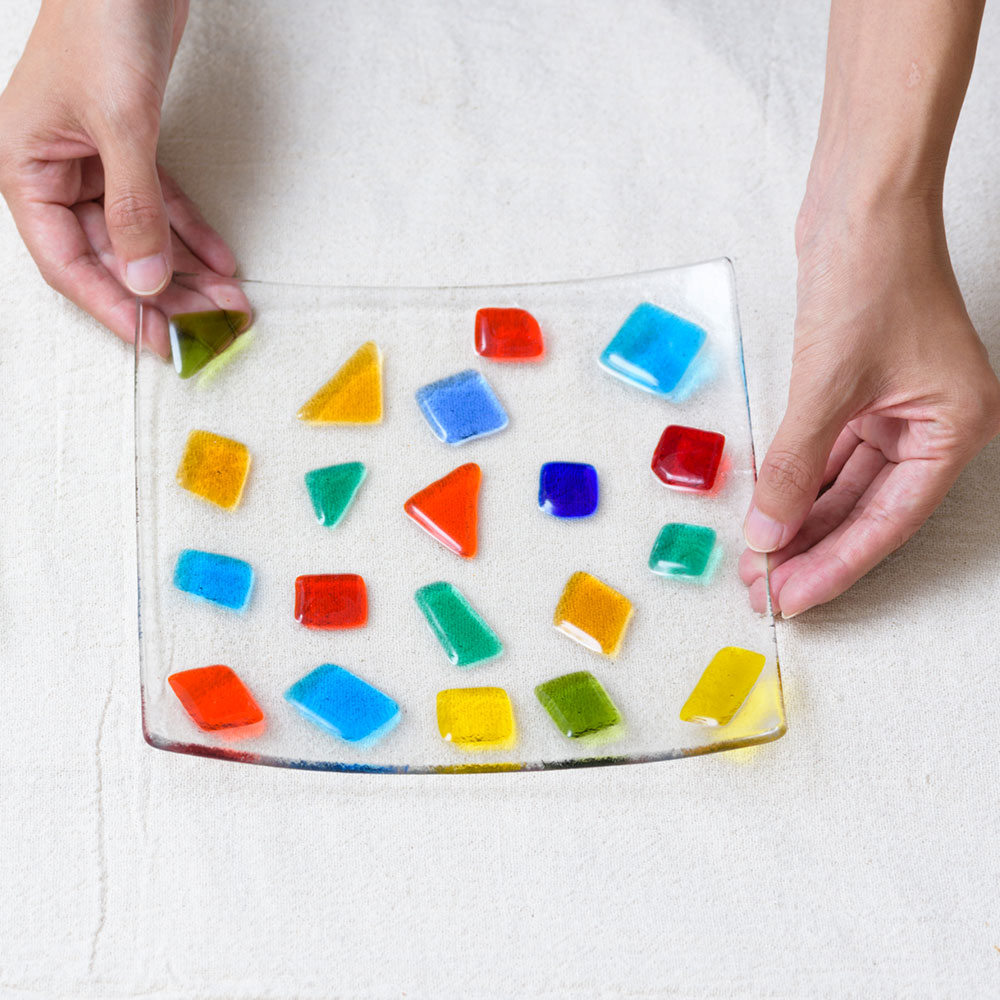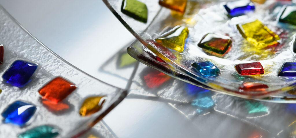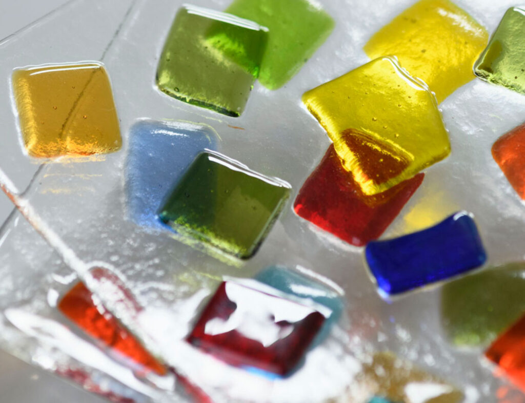 Jewel-like pieces of glass lavishly scattered to give the viewer a cheerful and rich feeling.