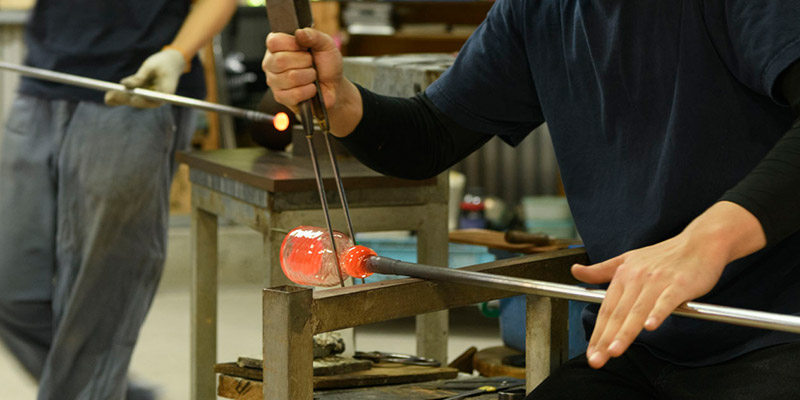 また、完成品のガラスはキラキと輝いていますが、ガラスをつくる工房の作業は、それとは真逆です。軍手は汚れて夏は汗まみれ、本当に泥臭い作業です。「ガラスが好き」という理由だけで来てしまうと、挫折しがちです。